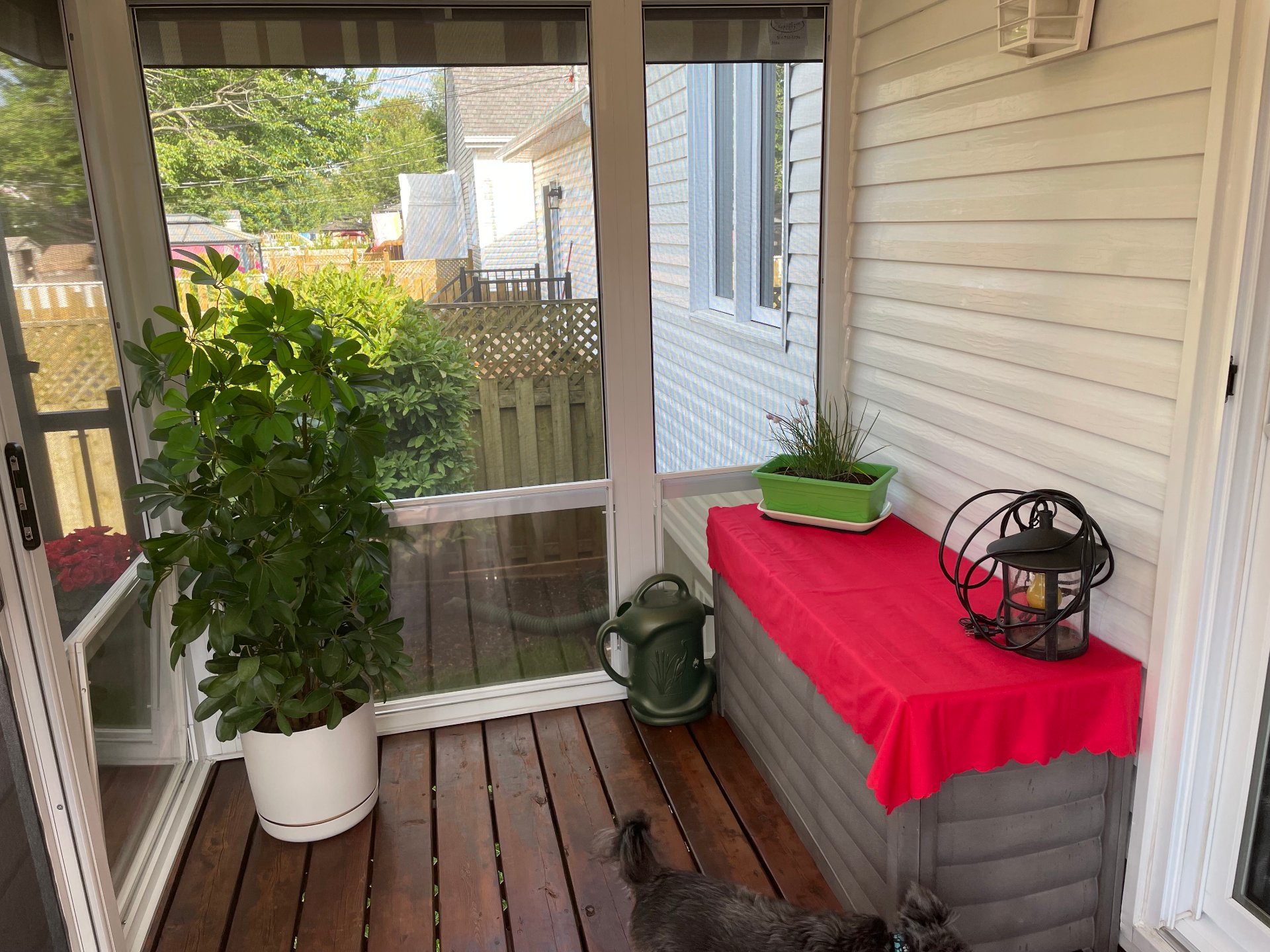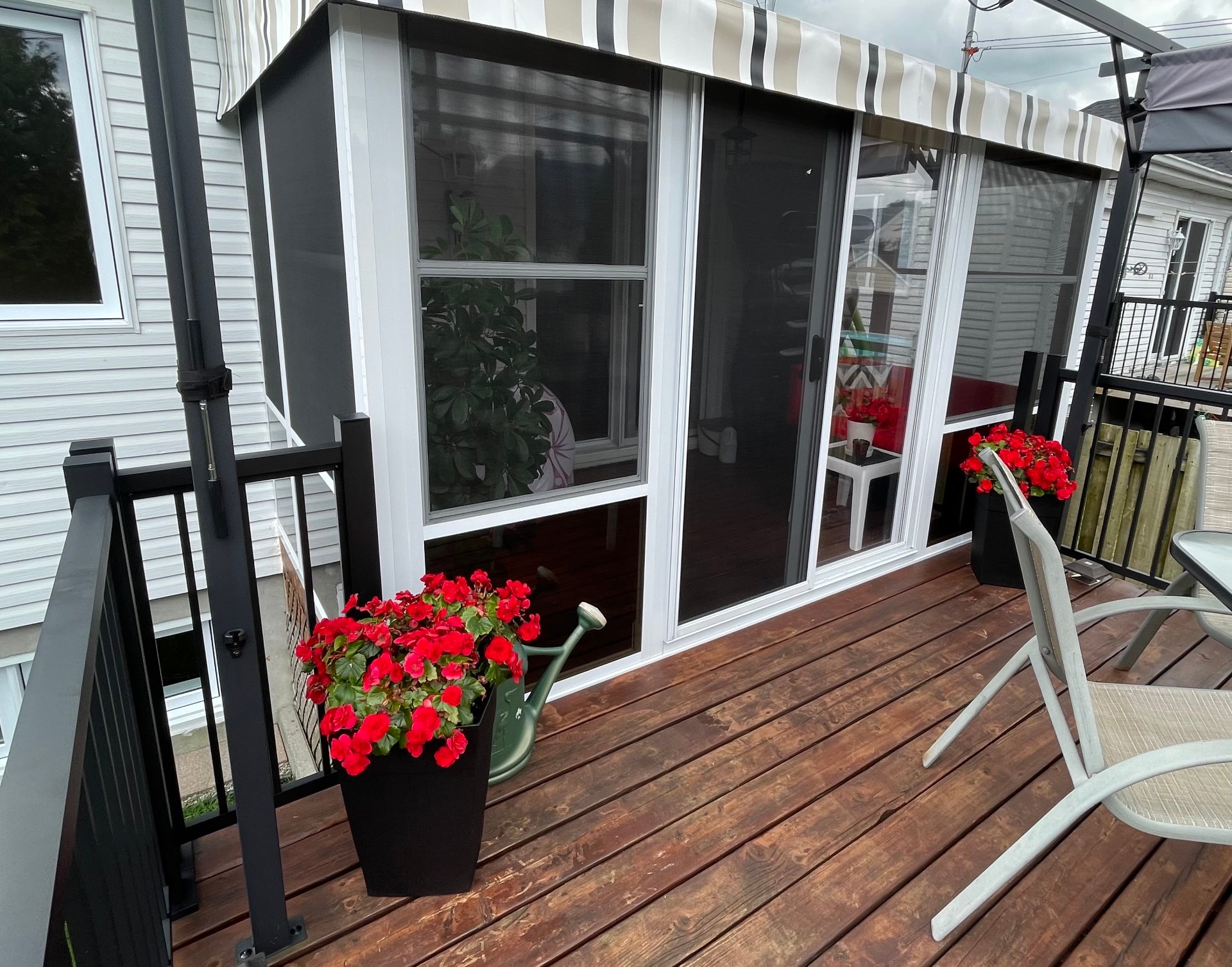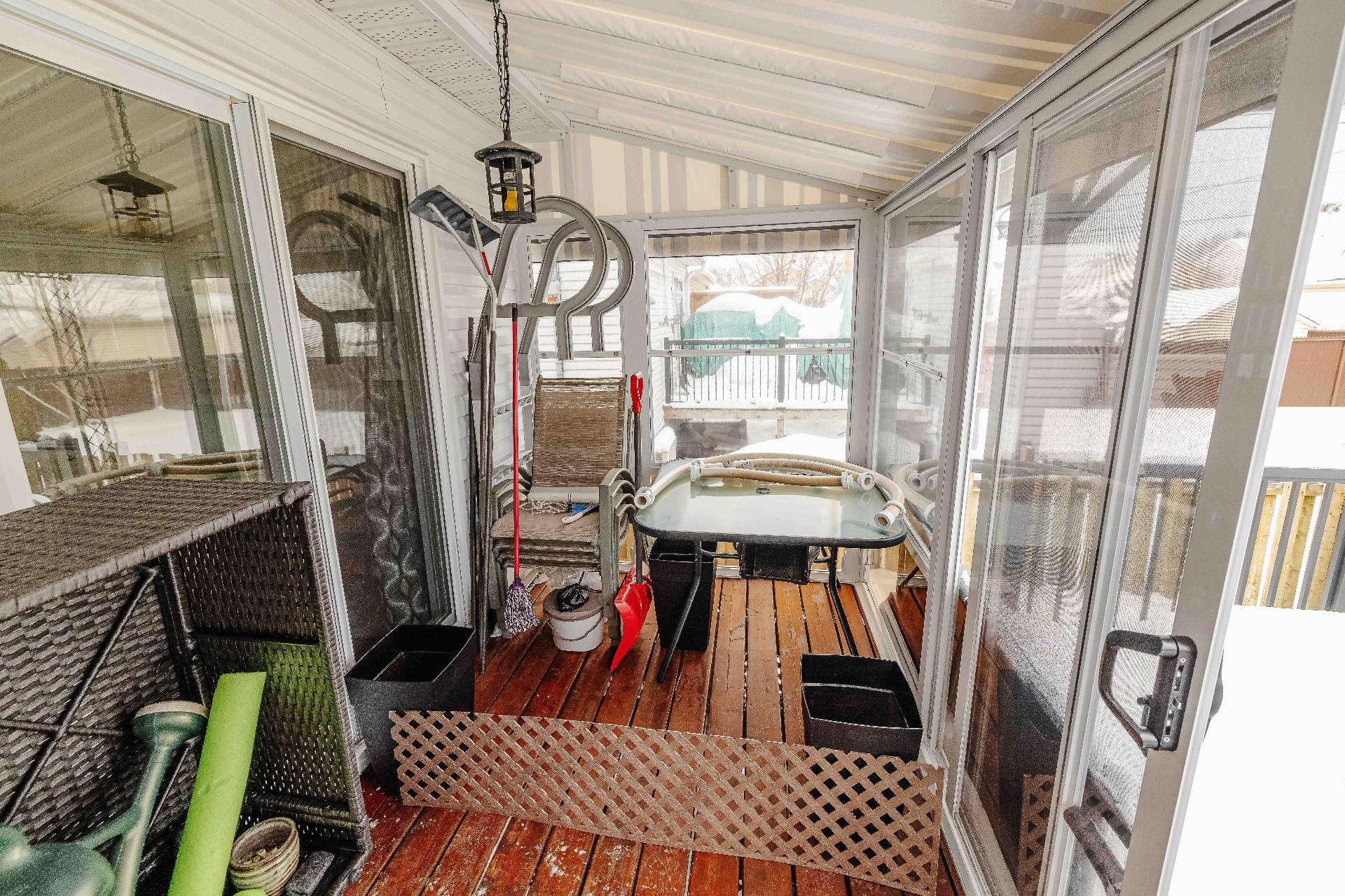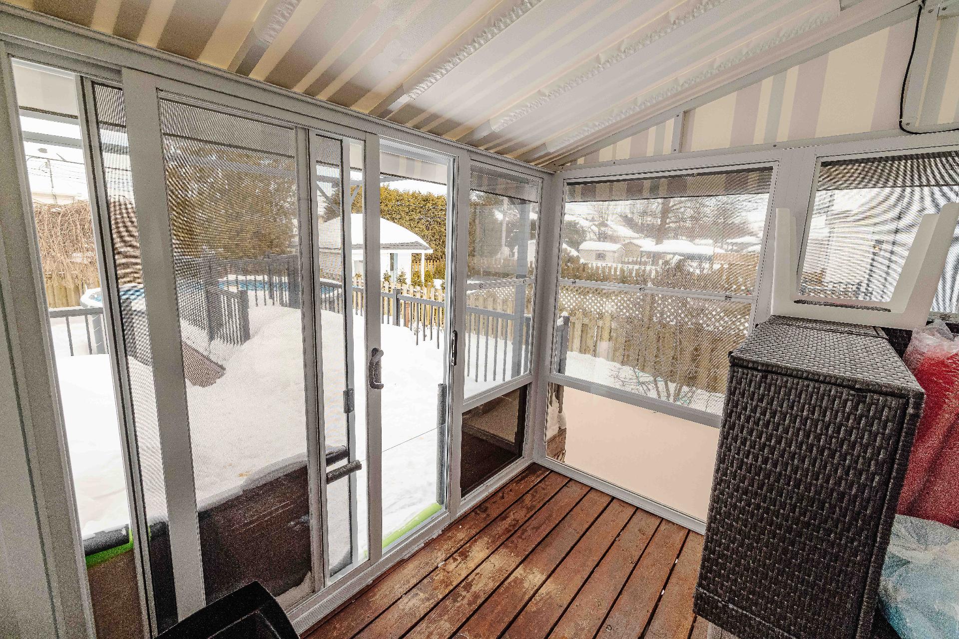 Pôles & rideaux, stores, luminaires & lustres, aspirateur central (défectueux),hotte, lave-vaiselle, pergola arrière avec toiles enrouleurs et solarium 3 saisons, ensemble table de patio avec 4 chaises, abris extérieu...