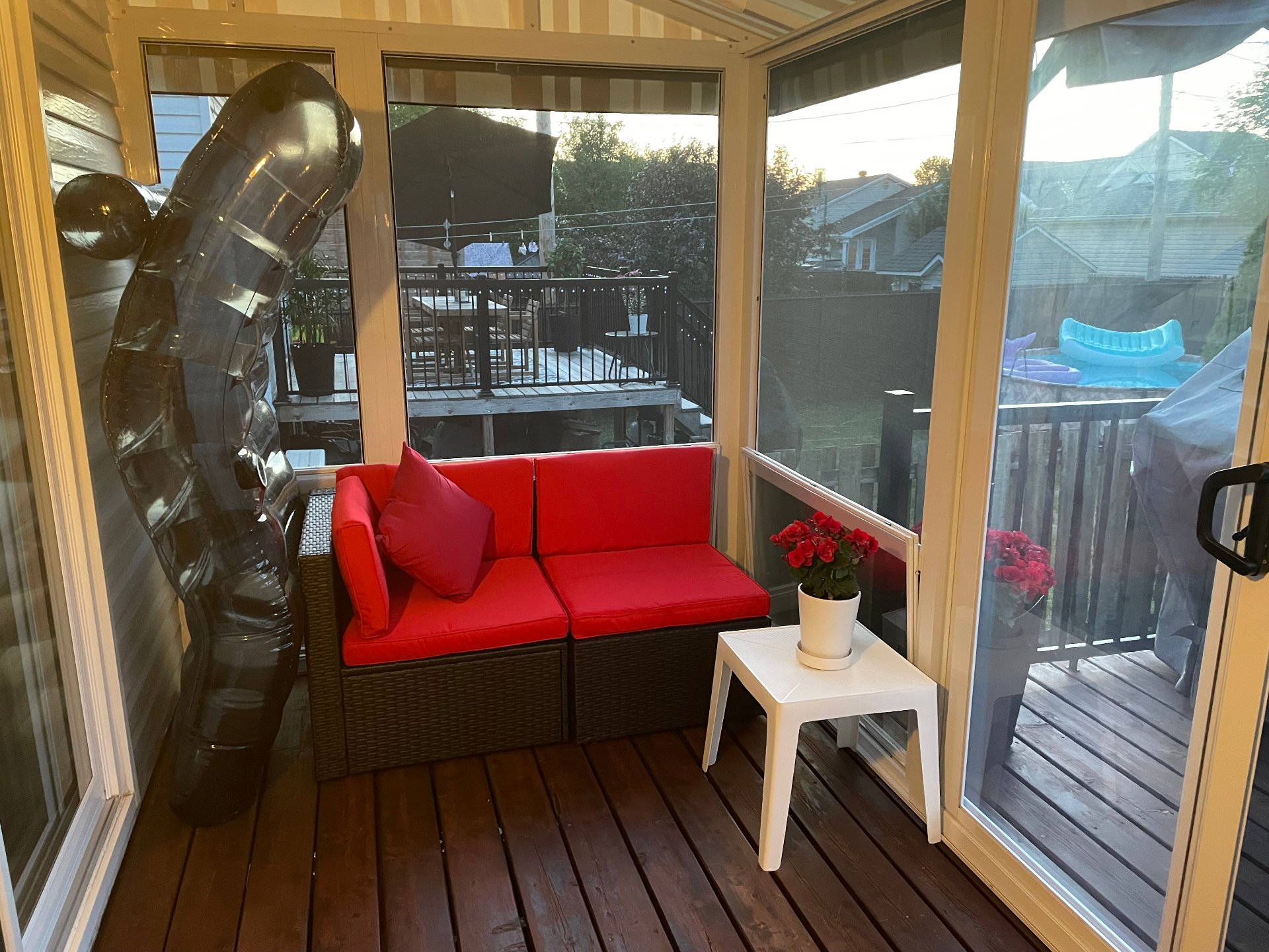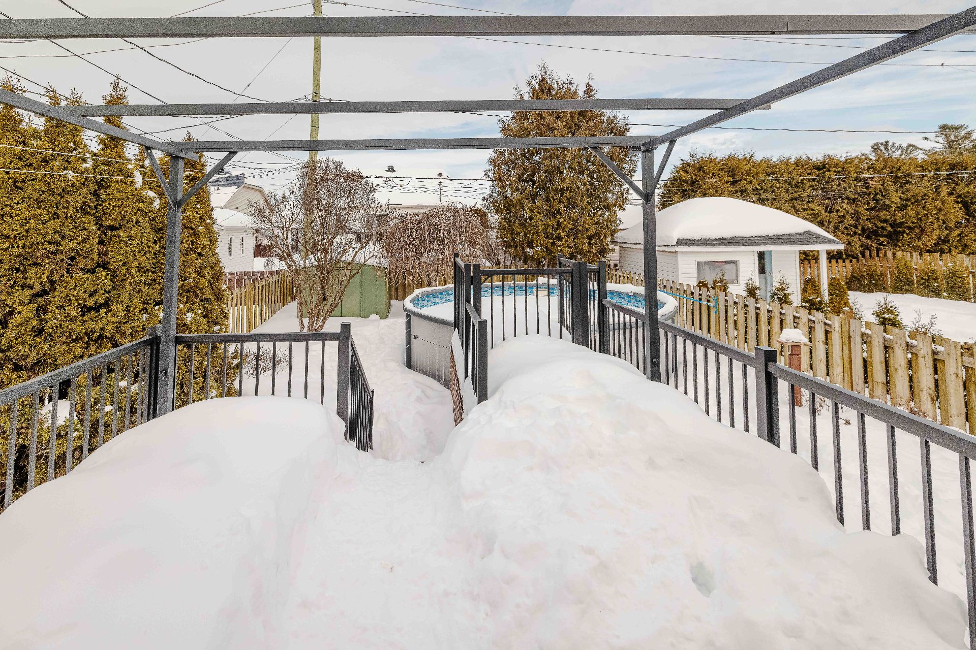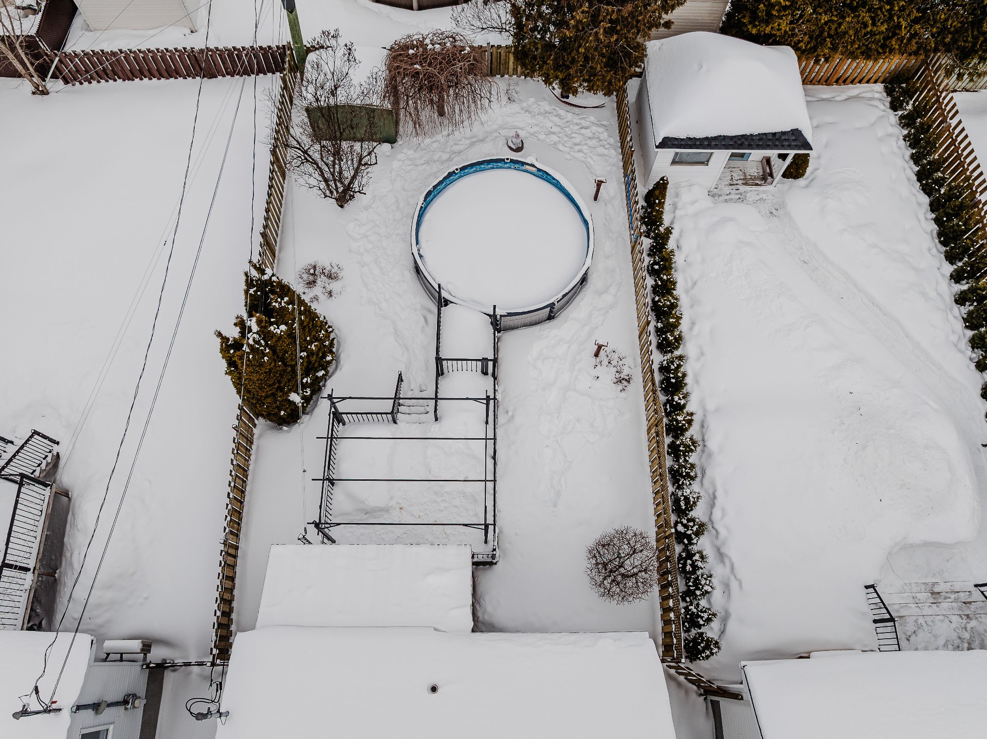 Pôles & rideaux, stores, luminaires & lustres, aspirateur central (défectueux),hotte, lave-vaiselle, pergola arrière avec toiles enrouleurs et solarium 3 saisons, ensemble table de patio avec 4 chaises, abris extérieur type ''tempo'' pour véhicule +/- 12x20 pi, abris extérieur type ''tempo'' porte entrée, piscine & ses accessoires, 2 déshumidificateurs, réfrigérateur, four, Salon : divan, meuble tv (fait sur mesure en angle), table café, 2 tablettes, système d'alarme non relié à une centrale